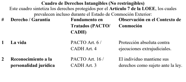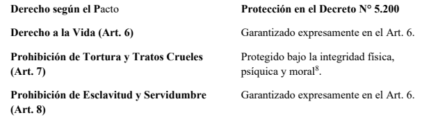 Incluso bajo el Estado de Conmoción Exterior declarado, el PACTO establece que ciertos derechos no pueden ser suspendidos en ninguna circunstancia. El Decreto N° 5.200 incorpora,